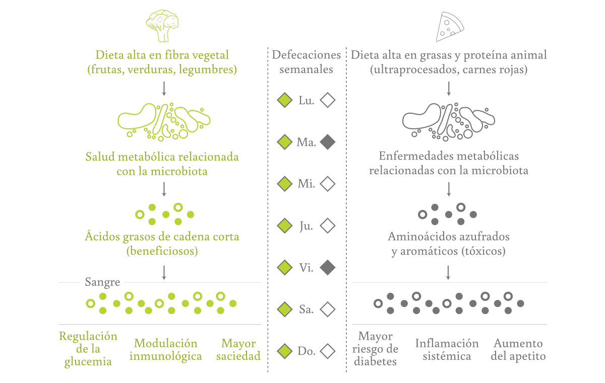 Lo maravilloso de la fibra es que sus efectos no quedan ocultos en los análisis de laboratorio ni en gráficos difíciles de interpretar. Podemos darnos cuenta bastante rápido de si estamos consumiendo lo que necesitamos —o si nos estamos quedando cortos— a través de un fenómeno cotidiano que todos experimentamos: cagar. En una sociedad que come pocas plantas, muchos consideran que es normal hacer caca día por medio o apenas un par de veces por semana. Pero cuando falta fibra, las heces suelen volverse duras, secas o difíciles de expulsar, y requieren de fuerza y tiempo, dos factores que aumentan el riesgo de hemorroides. Lo deseable es ir al menos una vez por día, sin esfuerzo ni dolor, y con heces bien formadas. Esto, que parece tan simple, es un marcador del estado general de salud muy importante y una señal notablemente subestimada de que el sistema digestivo está funcionando en sintonía. Es que además de eliminar desechos metabólicos, la materia fecal cumple funciones inmunológicas, hormonales y ecológicas, ya que transporta parte del ecosistema microbiano intestinal. Y como si fuera poco, también afecta nuestro bienestar emocional: cuando hacemos caca estamos más livianos y nos sentimos mejor.