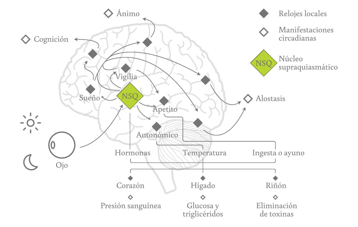 Pero hay un detalle: los cronómetros moleculares de las células no laten exactamente al mismo ritmo. Algunos van un poco más rápido, otros, un poco más lento. Sin un mecanismo que los mantenga alineados, esas pequeñas diferencias se amplifican con el tiempo, y lo que era una danza sincronizada se transforma en un desfile caótico. Por eso hace falta un director de orquesta que marque el compás general para que cada instrumento entre a tiempo, con el volumen justo y en el momento adecuado. Ese director existe, y lleva nombre propio: núcleo supraquiasmático, un grupo tímido de apenas 20.000 neuronas, ubicadas justo por encima del cruce de los nervios ópticos, en el medio del cráneo. Desde allí, recibe señales directas de la retina sobre la presencia o ausencia de luz, y con esa información, marca el ritmo del día. Pero no trabaja solo. Lo hace desde el hipotálamo, una región clave del cerebro que actúa como puente entre el sistema nervioso y el sistema endocrino. Desde allí, el núcleo supraquiasmático convierte la luz que recibe de la retina en señales que ajustan funciones esenciales como el sueño, el apetito, la temperatura corporal, las tareas de crecimiento y reparación, la respuesta al estrés, la sed, la lactancia, la reproducción y la inmunidad. En ese sentido, el núcleo supraquiasmático no solo dirige la orquesta, sino que además tiene acceso total a la consola del teatro: puede subir el volumen de unos instrumentos y bajar otros, hacer entrar a tiempo a las cuerdas o silenciar los metales, pero también controlar la iluminación, decidir cuándo se apaga la sala y se baja el telón. Lo más asombroso es que, incluso cuando se aísla este grupo de neuronas y se lo cultiva fuera del cuerpo, el núcleo supraquiasmático sigue marcando el tiempo con una precisión casi perfecta indefinidamente. Esa capacidad de sostener un ritmo autónomo, incluso en soledad, habla del grado de sofisticación que alcanzó este sistema a lo largo de la evolución.