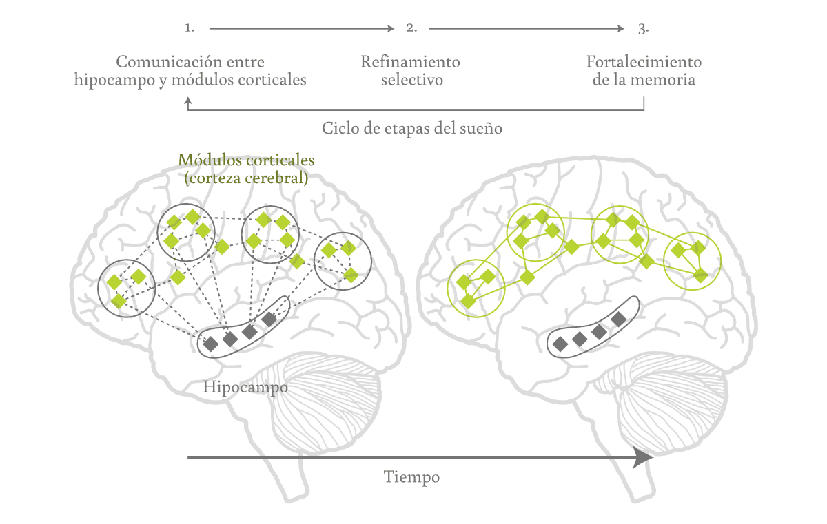 Para que esa capacidad de anticipar sea posible, el cerebro organiza la información en distintas escalas de tiempo. Por un lado, está la memoria a corto plazo, que nos permite retener lo que acaba de ocurrir durante unos segundos o minutos. Es la que usamos para recordar un número que nos dictan por teléfono o la frase que alguien dijo mientras pensábamos en otra cosa, pero también la que nuestros antepasados usaban para seguir el rastro fresco de un animal en movimiento y memorizar una serie de giros en el bosque. Es rápida, flexible y muy útil para tomar decisiones rápidas —especialmente en entornos inciertos—, pero también es frágil: si no se refuerza, se borra sin dejar huella. Por otro lado, está la memoria a largo plazo, que almacena lo que el cerebro considera verdaderamente valioso, como andar en bicicleta, las reglas de un deporte y el sabor de un plato de la infancia, pero también cómo volver a una cueva después de migrar durante semanas, qué plantas son comestibles y cuáles venenosas, y cómo tallar una piedra o curar una herida. Esa memoria es más duradera, más estable y está distribuida en distintas regiones del cerebro según el tipo de información: las imágenes se almacenan en la corteza visual, los sonidos, en la corteza auditiva, el lenguaje en las regiones temporales y frontales del cerebro, y las emociones se guardan en la amígdala y la corteza prefrontal.Aunque suele describirse a la corteza cerebral como un conjunto de áreas con funciones bien delimitadas, en realidad no se trata de un mapa fijo ni inmutable. El cerebro conserva a lo largo de la vida una capacidad significativa de reorganización funcional, conocida como plasticidad cortical. Cuando una modalidad sensorial se pierde o no se desarrolla —como en la ceguera o la sordera—, las regiones que habitualmente procesarían información visual o auditiva pueden ser reclutadas para otras funciones. En personas con ceguera, por ejemplo, hay zonas de la corteza visual que se activan durante la lectura en braille o el procesamiento del lenguaje; en personas con sordera, las áreas auditivas pueden participar en el procesamiento visual o de la lengua de señas. Esta reorganización no es ilimitada ni arbitraria, pero permite al cerebro reutilizar circuitos disponibles para adaptarse mejor a las demandas del entorno y la experiencia. En esa memoria de largo plazo no solo se acumulan datos útiles, sino también formas de vivir, de interpretar, de cuidar, de evitar el peligro y de transmitir lo aprendido. Pero para que una experiencia deje de ser un dato suelto y se convierta en recuerdo duradero, se necesita de un proceso que ocurre mientras dormimos: la consolidación de la memoria.
