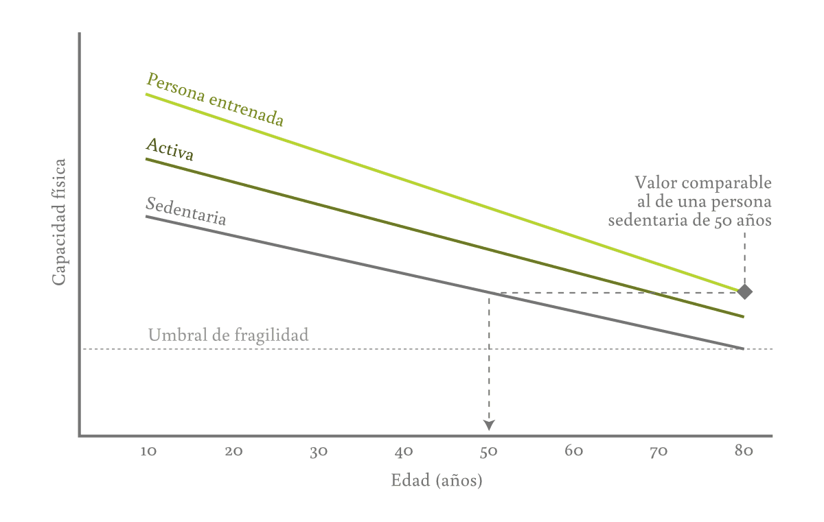 ósea. Luego, la pérdida de músculo y hueso está asegurada, y nuestra salud, en riesgo, a menos que hagamos actividad física para contrarrestarlo.