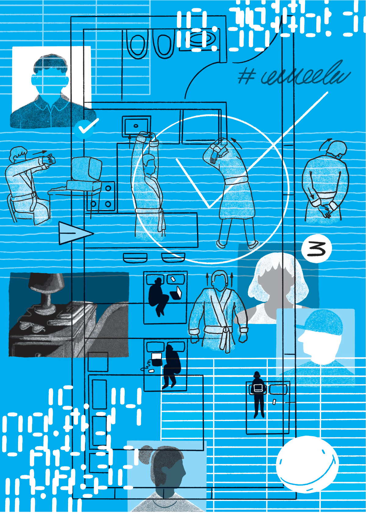 La cama: no se usa sólo para dormir. Se vuelve lugar único, continuo, sin horarios. Una persona comenta que la almohada tiene su forma. No lo dice como queja, sólo como dato. La cama deja de marcar el descanso y pasa a ser el centro de operaciones.