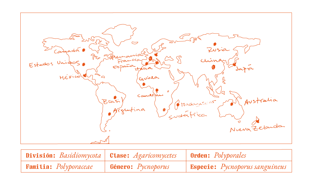 Su laboratorio del cuarto piso tiene paredes de ladrillos rojos y techos altísimos, estantes con libros y miles de frascos. En la mesada negra hay algunos aparatos que agitan los medios de cultivo. Lo hacen a través de unos imanes sumergidos que parecen girar por arte de magia —en definitiva, el campo magnético un poco lo es—. El sol de la tarde impacta de lleno por la ventana y atraviesa las tablas horizontales de la persiana americana, la luz se filtra entonces formando rayas anaranjadas. Leo busca entre los cajones y encuentra un ejemplar de Pycnoporus, algo seco y envejecido, pero que conserva su pigmentación intensa: ese rojo-anaranjado furioso de la luz que entra de afuera se repite en el hongo, y es como tener un atardecer en las manos. Me muestra la parte superior, el píleo suave —aterciopelado cuando es joven, pero que con el tiempo se vuelve liso—, y luego la parte inferior, donde se encuentran los poros. De inmediato enciende la luz de una lupa, coloca el ejemplar sobre la platina y me invita a observar. Miro a través de los oculares, muevo el foco hasta que la imagen se vuelve nítida, y los veo: la superficie está cubierta de pequeños agujeros contiguos, que se asemejan a un coral. Algo en esos círculos pegados me atrae y no puedo dejar de mirarlos. Recuerdo que hay gente que padece tripofobia y siente aversión total por estas formas. A mí me resultan hipnotizantes.