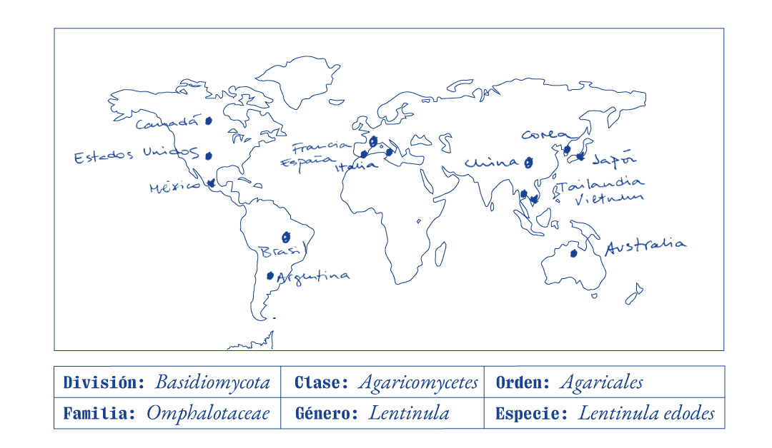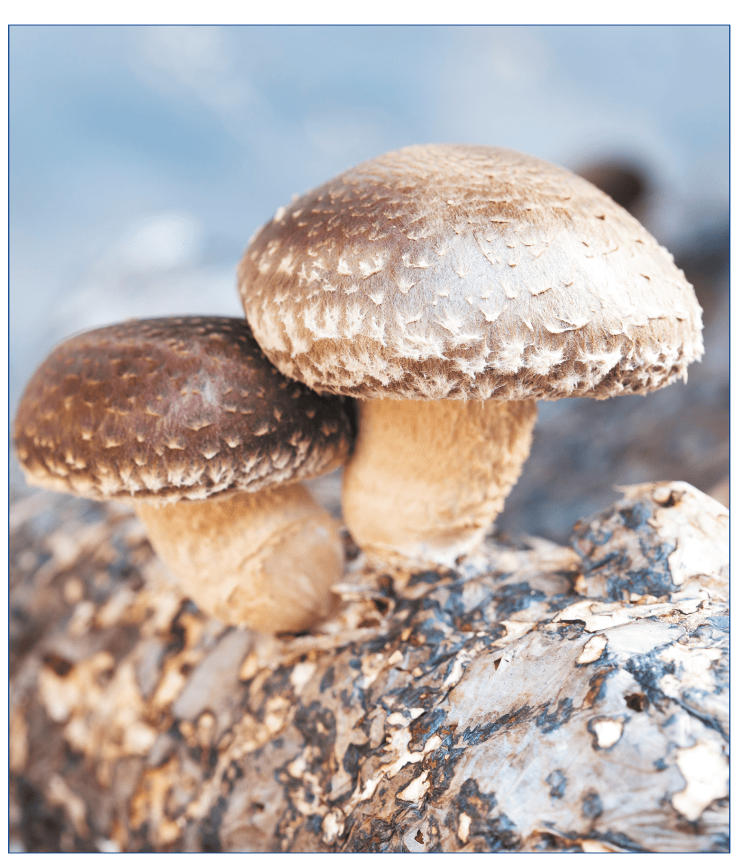 El shiitake —o Lentinula edodes—, además de un sabor umami profundo que se mantiene en la boca,tiene una textura aterciopelada y es carnoso, con muchas vitaminas, sobre todo vitamina B, y presenta altos niveles de zinc, hierro, manganeso y fósforo. Su sombrero es marrón, tostado. En la naturaleza crece en madera en descomposición, puede ser de roble, arce, haya o castaño. Es probable que el shiitake sea el primer hongo cultivado por la humanidad. Hay registros que se remontan al año 1200 en China. Y en Japón se aplicaba una técnica peculiar: los artesanos cortaban troncos, les realizaban unos agujeros en la superficie y los rellenaban con inóculo de shiitake. Luego se cubrían los agujeros con cera y se apilaban. Cuando el micelio llegaba a los extremos de los troncos, ya estaban listos para fructificar.