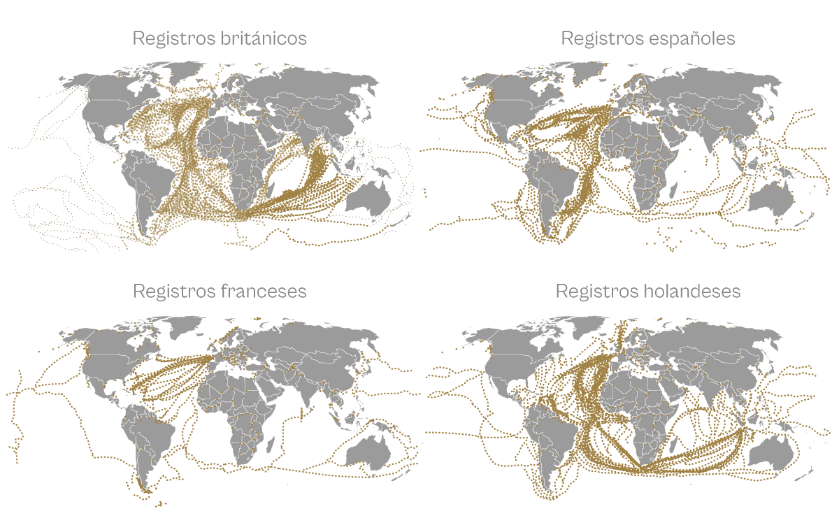 Rutas marítimas coloniales (1700-1850). Flujo de comercio transnacional de las principales potencias de los siglos XVIII y XIX, reconstruido a partir de las bitácoras de viaje.