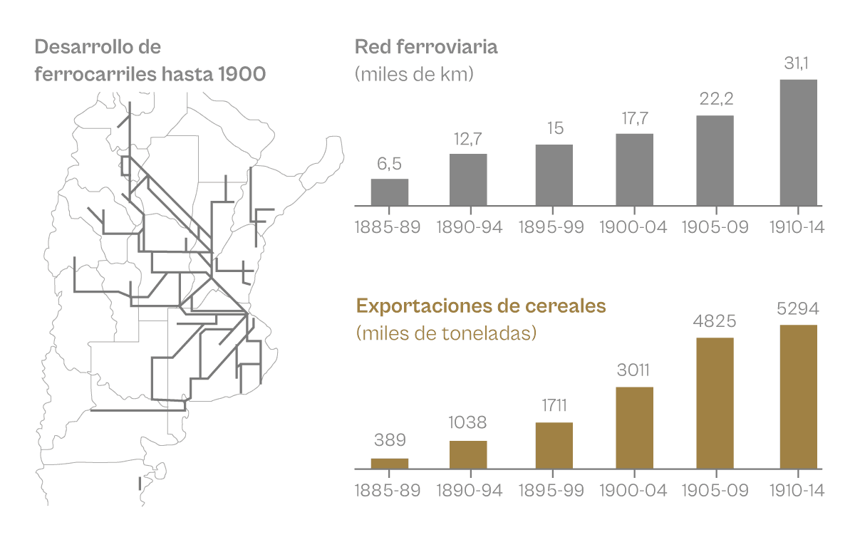 El esquema agroexportador. Población, tendido de vías férreas y exportaciones de cereales en el periodo 1885-1914.