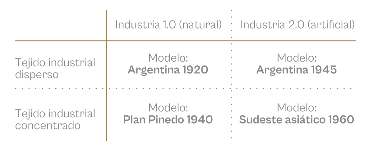 Un eje va de la industria 1.0, o “natural”, plenamente abastecida por los recursos locales y avanzando en la cadena de valor de las exportaciones tradicionales, hasta la industria 2.0, o “artificial”, desenganchada de las ventajas naturales y buscando competitividad en su propio ecosistema.