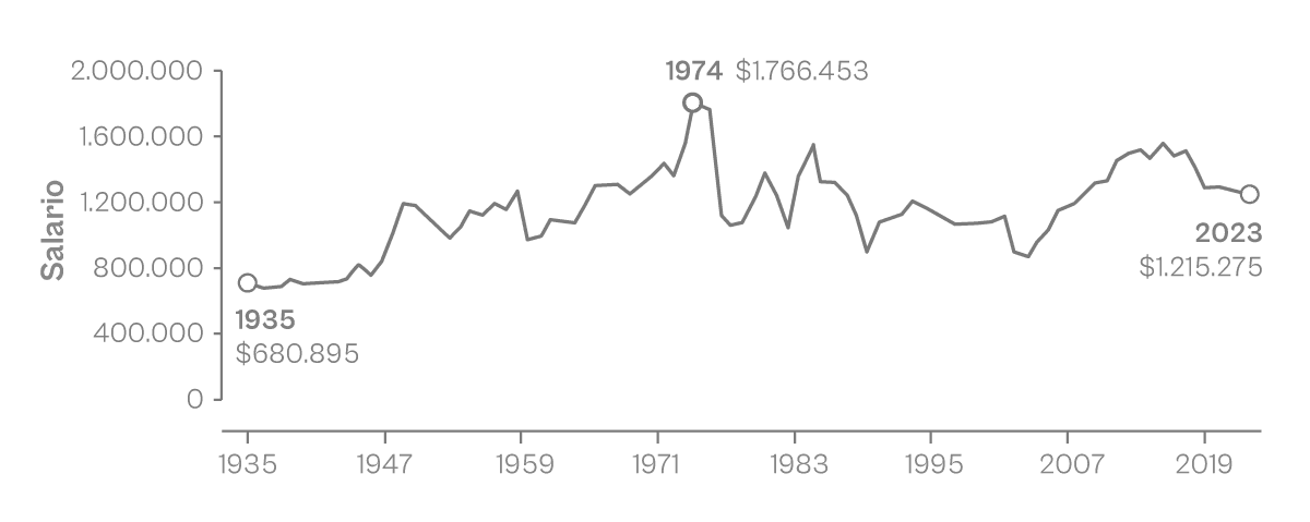 La clase trabajadora. Salario mensual promedio (en pesos constantes de julio de 2024) en el periodo 1935-2022. En comparación, la tasa de desocupación en el periodo 1991-2023.