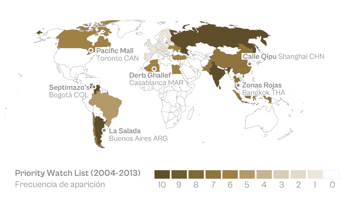 Mercados informales. La Oficina del Representante Comercial de los EE.UU. (USTR) realiza un monitoreo de mercados informales. El mapa indica niveles de prioridad de vigilancia y mercados “notorios”, entre los que se incluye “La Salada”, para el periodo 2004-2015.