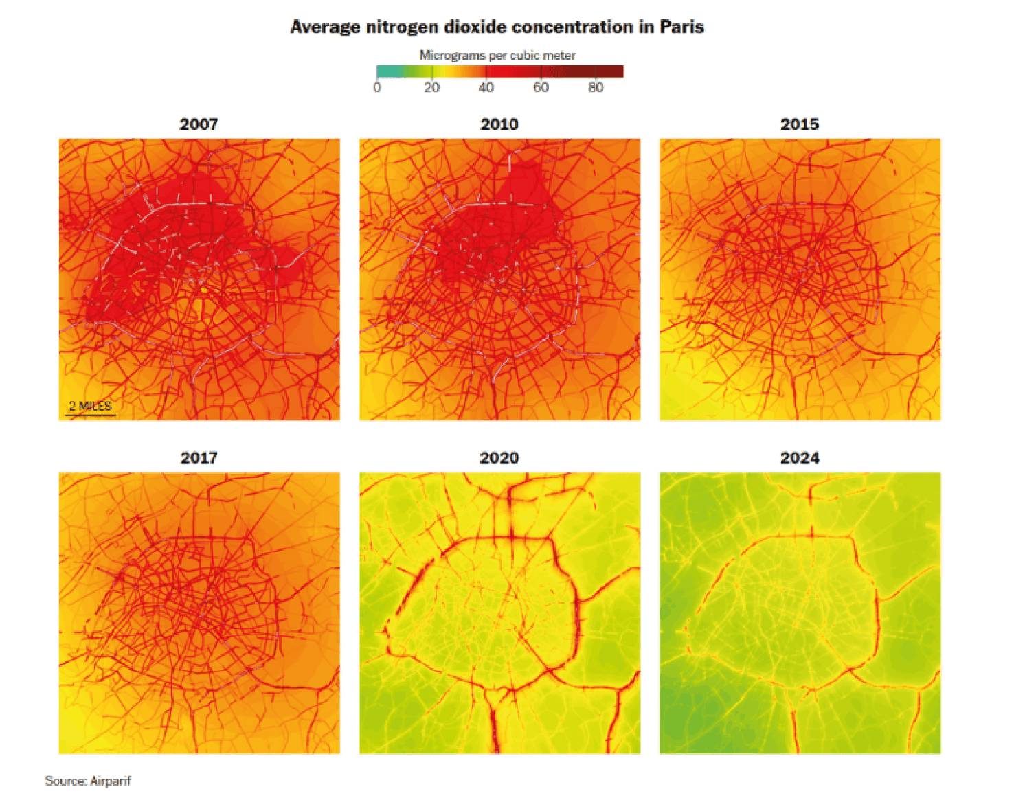 Fuente: Airparif. Mapas de París luego de reducir drásticamente el espacio para autos y ampliar zonas peatonales y ciclovías. Reflejan la evolución en los niveles de dióxido de nitrógeno, un contaminante que se forma cuando se queman combustibles fósiles a altas temperaturas y que contribuye tanto al smog como al calentamiento urbano.