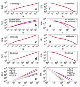 Podemos ver en a-d y f-i datos reales de Wikipedia, Last.fm, del.ici.ous y el Proyecto Gutemberg reproduciendo las leyes de Zipf y Heaps. e y j muestran lo que pasa cuando se pone a correr el modelo de Urna de Polya gatillada por novedad, y se generan modelos que reproducen ambas leyes. El trabajo original también incluye modelados muy interesantes sobre la entropía de los datasets (tanto la entropía local como global), y cómo este modelo reproduce fenómenos observados en estos datasets, lo que le da mucha robustez a esta idea pero es un poco más árido de compartir y prefiero dejarlo para los aventurados).