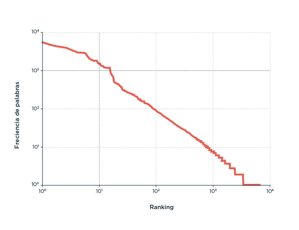 Envalentonado yo −y contando con amigos que manejan Python (atribución indispensable de crédito a Pablo Riera en este punto)− convertimos juntos todas las notas del último año a texto y aprovechamos un script para ordenar la frecuencia de palabras en función de su ranking de uso y graficarlo (acá los txt, por si alguien quiere jugar).