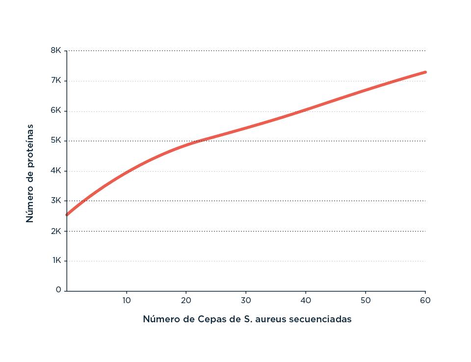 Aparición de una curva típica de Heaps para el análisis de la frecuencia de aparición de genes nuevos a medida que se van incorporando al análisis genomas completos (Fuente).