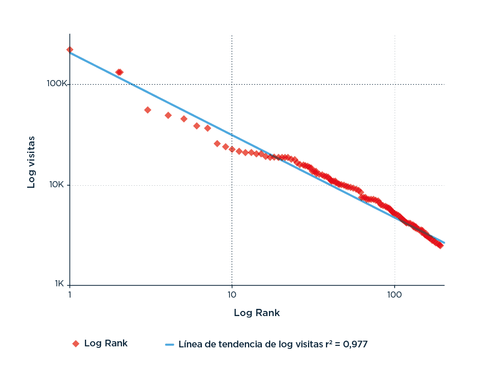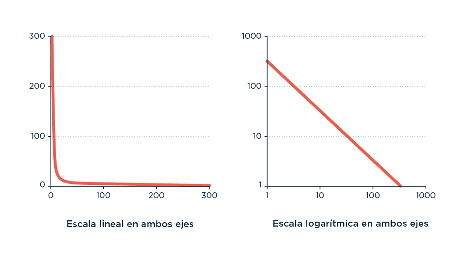 Figura CLAVE para el grupo que intersecta los no amantes de graficar cosas con los no amantes de los logaritmos. Dado que las distribuciones tipo ‘power-law’ son relaciones exponenciales, una forma de observar más claramente los patrones es graficar los puntos no en un eje lineal sino en un eje donde tanto la x como la y son transformadas aplicando el logaritmo. Así, pasamos de la interesante pero difícilmente informativa forma de L en el gráfico lineal-lineal a la coqueta linealidad del gráfico log-log. Esta es la razón por la que algunas de las figuras que representan distribuciones de Zipf lucen de una manera y otras de otra, aun siendo solamente dos formas visuales de representar lo mismo. Lo importante acá es tatuarse ‘atención: leer siempre los ejes’.