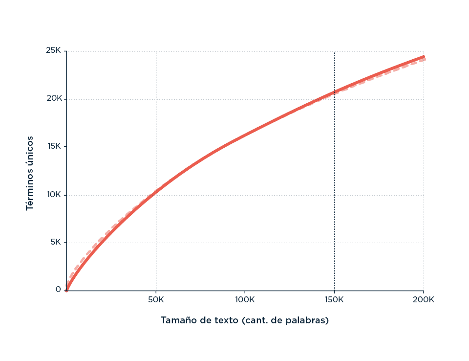 A veces nos topamos con descripciones de la realidad que no tenemos idea de dónde vienen, pero que funcionan, y funcionan tan bien que se ven representadas en múltiples dominios que a priori no imaginamos como evidentemente análogos. Uno de esos modelos es la Ley de Heaps, que describe la forma en la que aumenta el tamaño del vocabulario (la cantidad de palabras únicas observadas en el texto) en función de la cantidad de texto que se observa.