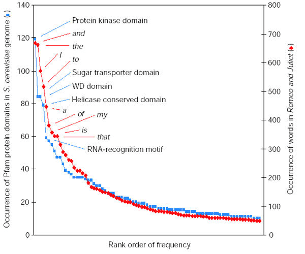 Pero la Ley de Heaps se pone más general cuando se empieza a observar que no sólo describe la aparición de palabras nuevas en corpus de texto, sino también la aparición de genes nuevos a medida que secuenciás genomas completos.