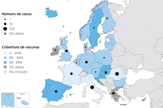 Los puntos negros del mapa muestran los brotes de sarampión que están ocurriendo en Europa ahora, con focos especialmente grandes en Italia y Rumania. La tonalidad de azul que tiene cada país indica la cobertura de vacunación de sarampión para cada uno. Podemos ver una relación entre menor cobertura de vacunación y cantidad de casos de sarampión. (fuente).
