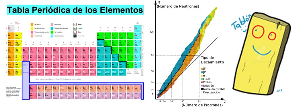 La cantidad de protones determina el elemento químico (Plata, Nitrógeno, Litio, Oxígeno, etc, etc), que puede tener un número más o menos variable de neutrones. Los átomos de un mismo elemento con distinta cantidad de neutrones son los dichosos isótopos de ese elemento. Así como en química se ordenan los elementos en la tabla periódica de Mendeleiev, los isótopos se ordenaron en la tabla de Segré.