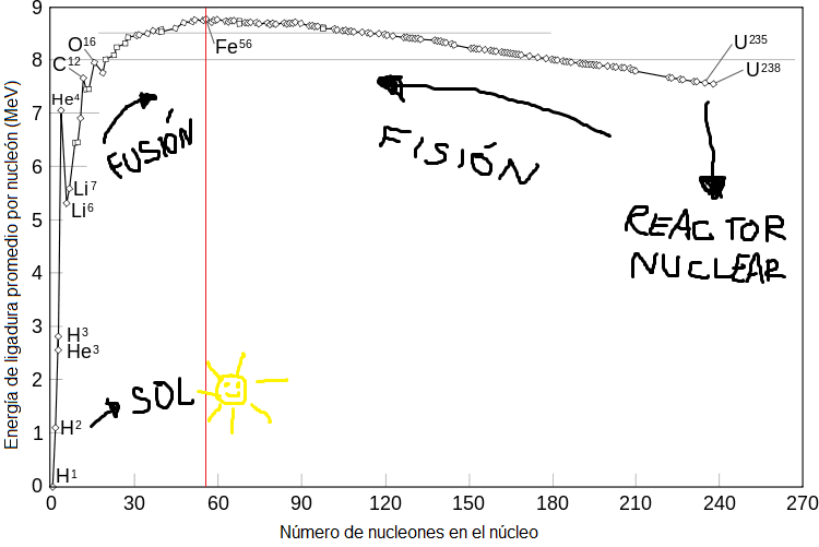 Fenómeno, junto dos núcleos livianos y tengo uno más liviano que la suma de los dos por separado, ganando energía en el proceso. Así podemos ir cocinando átomos hasta llegar al hierro (Fe). Y acá la cosa se pone peluda para las estrellas que están en la última etapa de su vida, ya que fusionar dos núcleos de hierro cuesta energía. Para los elementos más pesados que el hierro nuestra balanza se invierte: ahora el núcleo más pesado pesa más que los elementos constituyentes. O sea que la ganancia de energía se da rompiendo el núcleo grande en pedazos. Este proceso es la fisión.