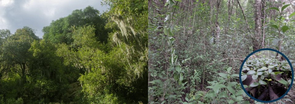 A simple vista ambas imágenes pueden parecer sólo un montón de plantas juntas. Pero cuando vemos en detalle, la imagen de la izquierda (monte nativo) tiene una gran diversidad de plantas, mientras que en la figura de la derecha (bosque de siempreverdes) predomina la monotonía. En la foto pequeña de la imagen de la derecha, un zoom al suelo del bosque de siempreverdes, donde se ve la nueva generación de pequeños invasores.