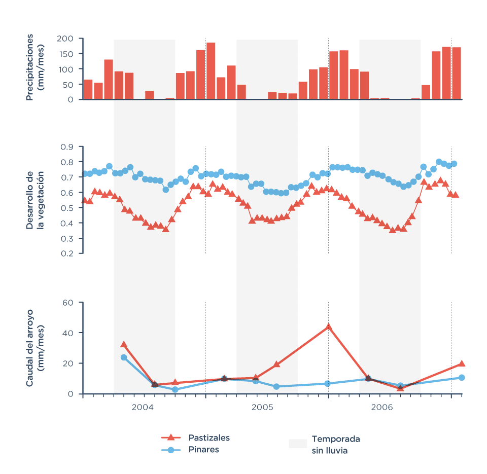 Mientras que los pastizales nativos adaptan su crecimiento de acuerdo a la disponibilidad de agua, los pinos (invasores oriundos de ambientes con gran disponibilidad de agua) se comportan como infantes caprichosos que exigen agua constantemente, dando como resultado que los arroyos que atraviesan los pinares aporten bastante menos agua a lo largo del año que los que atraviesan los pastizales (hasta un 50% menos). (FUENTE)
