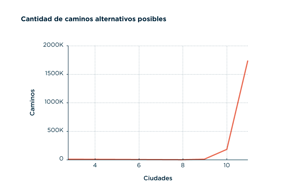Podemos ver cómo la cantidad de combinaciones despega de golpe y entra en modo ‘al infinito y más allá’, complicándole la vida a cualquiera, pero al mismo tiempo ofreciéndole el problema de una carrera académica completa a múltiples investigadores especializados en problemas de optimización.