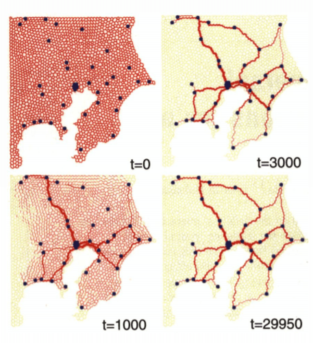 Nuestras redes modernas de transporte se basan en la emergencia de caminos durante milenios. Al principio teníamos sólo caminos prehistóricos, del mesolítico, conformados de pisadas de humanos buscando unir asentamientos o geografías ricas en recursos, hechas a fuerza de prueba y error o basadas en los caminos elegidos por los animales (mediante procesos similares de prueba y error). Mucho después vendrían desarrollos orientados por las ciudades, desde los puestos del 1700 dando lugar a carreteras para carruajes, primero de una vía, después de dos, creciendo eventualmente hasta generar autopistas y redes ferroviarias. Pero el camino de los caminos siempre cae en las mismas preguntas: ¿son estos caminos eficientes? Si los hiciéramos hoy desde cero, ¿serían parecidos? ¿Cómo podemos pensarlos para ser eficientes en términos de costo, pero al mismo tiempo resilientes a la falla? Podemos reunir ingenieras, diseñadores urbanos y de redes de transporte, matemáticas y computólogos. O podemos tirar un hongo y verlo crecer.