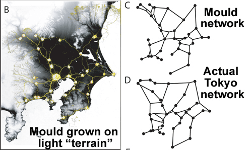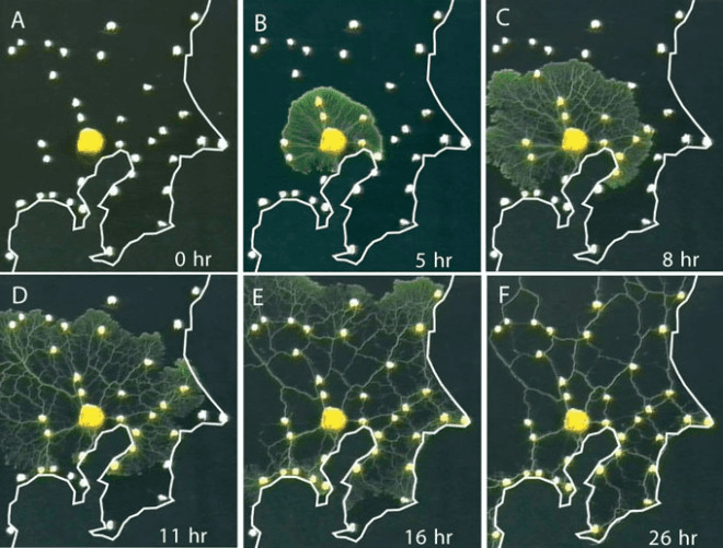 Pero la potencia de este chiquilín de ninguna manera termina acá. Así como puede unir dos puntos eficientemente, se impone la pregunta de si puede unir más. Así es que un grupo de investigadores decidió presentarle un desafío: vamos a poner una plaquita de petri (medio de cultivo donde puede crecer el moho) con comida en lugares que imitan la posición geográfica de centros urbanos alrededor de Tokio y ver cómo conecta esos puntos.