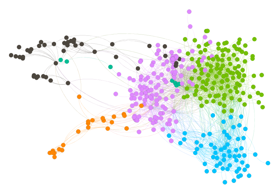 Mi red de amigos de Facebook, con su identidad preservada para que no tengan que hacerse cargo de ser mis amigos. Cada nodo representa a una persona, las aristas aparecen sólo si esas personas son amigas entre sí. De esas interacciones emerge cierto orden. En verde, el clúster más bien Gato: la gente que fui conociendo al hacer esto mismo que hago ahora. En celeste, mi vida universitaria (Exactas <3) , en rosa el clúster más bien diseñoso/periodistoso/proyectista que conocí de redes sociales. El naranja y negro muestran lo poco que se incorporaron mis compañeros de primaria y secundaria (respectivamente) a las otras tres etapas de mi vida.