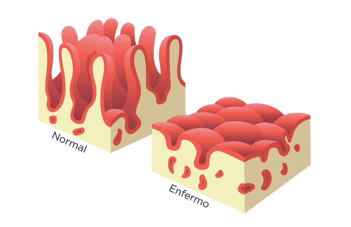 Vellosidades del intestino delgado en una persona con intestino normal y en una persona con el intestino dañado por la celiaquía.