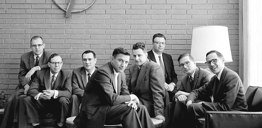 Los niños de Fairchild, 1957. Entre ellos Bob Noyce, el del medio adelante, y Gordon Moore, primero a la izquierda –Moore el de la Ley de Moore, una fórmula que predice el crecimiento exponencial de la evolución de las computadoras que todavía funciona al día de hoy.