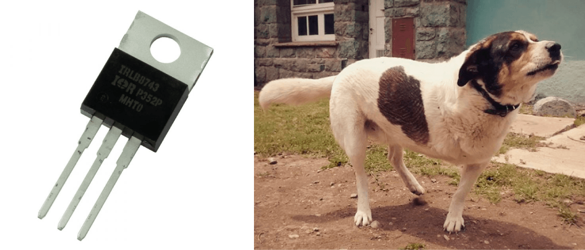 A la izquierda, el semiconductor que revolucionó la electrónica. A la derecha, Transistor, la mascota oficial del Instituto Balseiro.