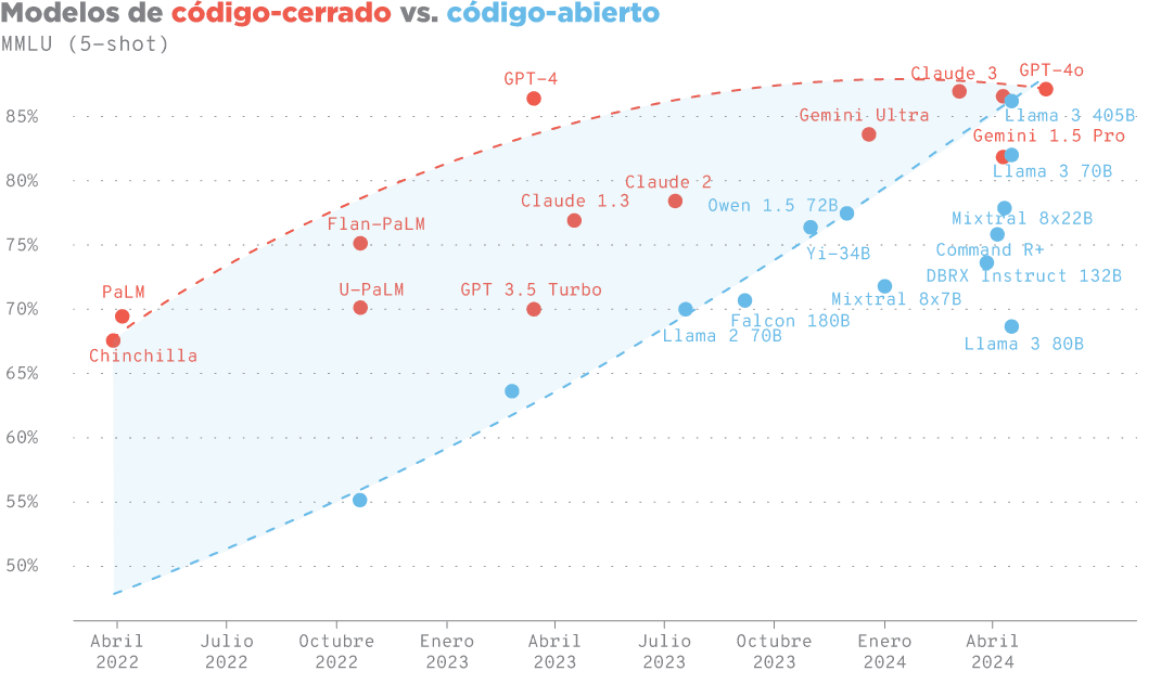 La brecha entre los modelos cerrados y públicos se está cerrando. Con las últimas versiones de LLaMA, los modelos de código abierto se pusieron al día y lograron performances competitivas con los mejores LLM privados. A principios de 2025 esta situación se consolidó con fuerza: al lanzamiento del modelo cerrado de vanguardia o1 le siguió una versión pública comparable (DeepSeek-R1) en tan solo 2 meses. Fuente.