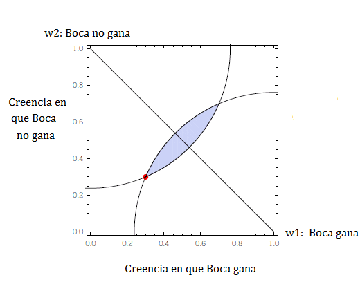 Elijamos pensar, por ejemplo, que Boca ganará en grado 0.3, y también creamos que no ganará en grado 0.3. Obviamente esto es incoherente porque me faltan 0.4 para el mango (o para que las condiciones p y ¬p sumen 1). Lo que todavía no tuvimos en cuenta fue la realidad. Si Boca gana (mundo w1), habría muchas asignaciones de probabilidad más cercanas al mundo real que nuestra creencia original: todas las que están dentro del círculo que dibujamos en torno a w1. Por otro lado, si el mundo real fuera w2 y Boca no gana, habría muchas otras asignaciones más cercanas al mundo real (todas las que están dentro del círculo que dibujamos en torno a w2). El área sombreada representa las asignaciones que están más cerca de la verdad en ambos escenarios. Y es fácil ver que dentro del área gris hay asignaciones probabilísticas (las que forman parte de la diagonal). Esas asignaciones probabilísticas dominan nuestra creencia incoherente original: son mejores que nuestra creencia original pase lo que pase en el partido.