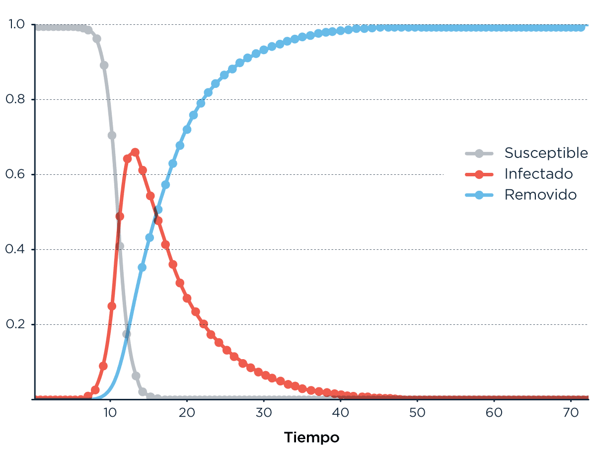 Este es el modelo más simple y tiene un montón de supuestos, el primero y tal vez más importante es la unidireccionalidad: la persona pasa de Suceptible a Infectada y de Infectada a Removida. Nunca en sentido contrario. Esos cambios de estado los gobiernan distintos factores. El paso de S a I es afectado por: el número de contactos que cada persona tiene con otra, el estado y proporción de personas en distintos estados en la población (no es lo mismo salir a la calle y encontrarte a un Infectado que a un Susceptible, y esa probabilidad cambia a medida que progresa el desarrollo de la infección), y la probabilidad de que esa interacción resulte en una infección. El paso de I a R depende del tiempo que transcurre entre que una persona es infectada y es −ejem− removida.
