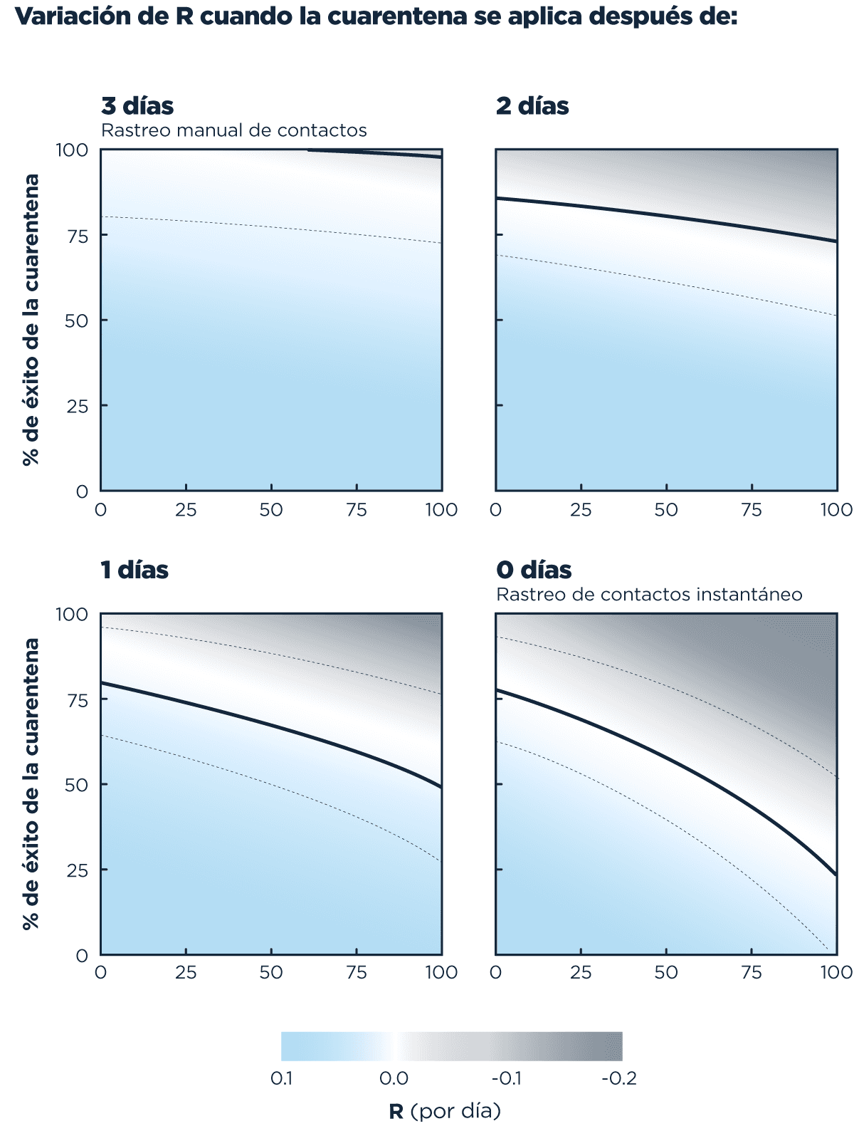 Mal y pronto, mientras más celeste, peor, más gris, mejor. De la línea negra para arriba estás disminuyendo R, de la línea negra para abajo, aumenta. Mientras más rápido se identifica el caso y más rápido se aísla, más arriba y a la derecha, menor R.