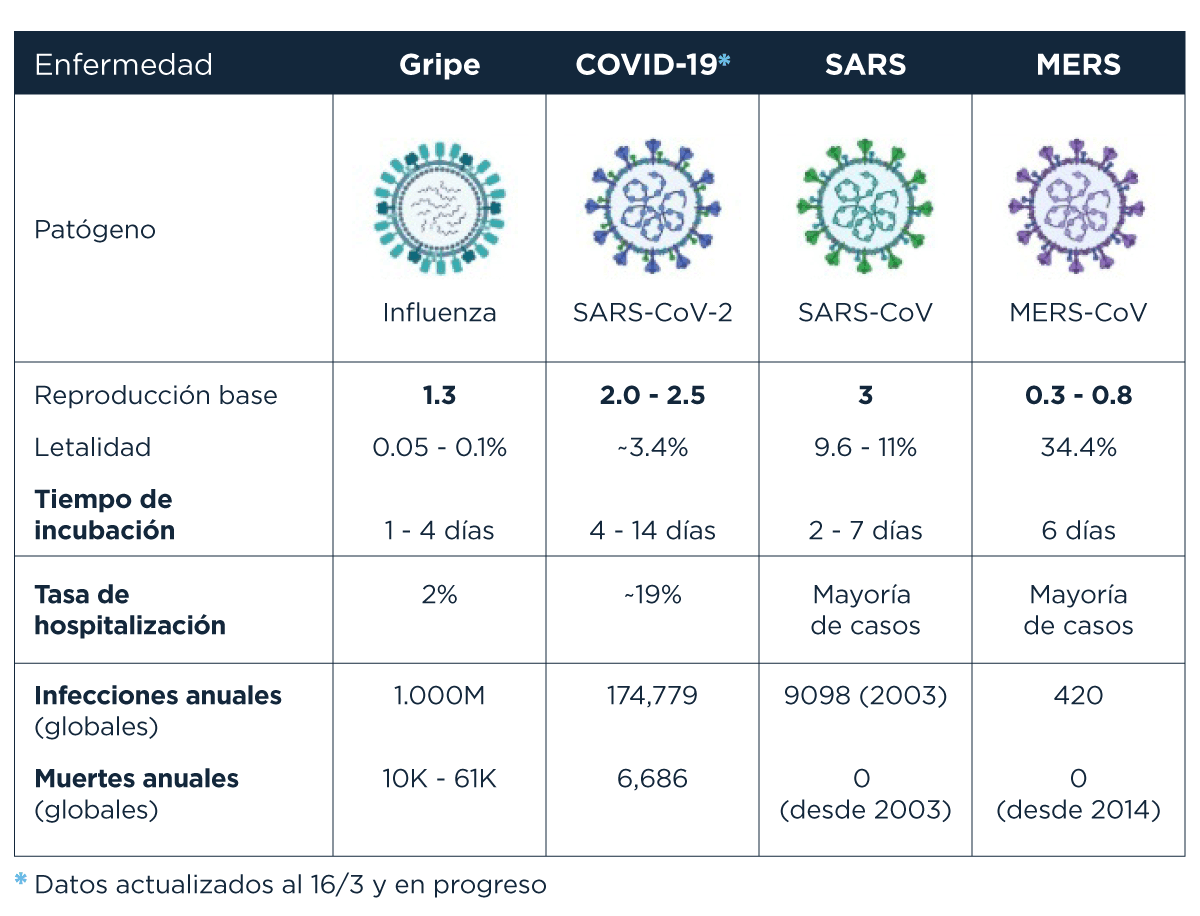 Si bien el SARS-Cov-2 (el virus causante de la enfermedad denominada COVID-19) produce síntomas similares a los que causa el virus de la gripe, sabemos todavía poco sobre él. Lo que sí sabemos es que se transmite mucho más que la gripe, que la población de personas que lo adquiere tiene una mayor necesidad de hospitalización y que la tasa de mortalidad es mayor. Una de las claves de su capacidad de reproducirse es que hay una período asintomático largo (se estima en alrededor de 5 días pero puede extenderse hasta 14, en contraste con los 7 días de la gripe). Si bien es menos frecuente que la transmisión durante el período sintomático, el contagio desde una persona sin síntomas puede ocurrir.