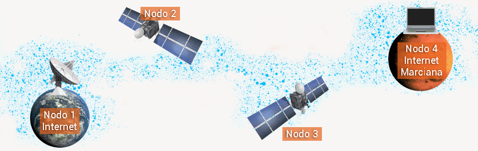 En DTN lo que se hace es integrar redes basadas en el modelo conversacional como TCP/IP dentro de otra red basada en el modelo epistolar que no asume un diálogo instantáneo entre sus pares. En esta red, un nodo DTN puede estar formado por un satélite en Marte, un astronauta en la Luna o la Internet terrestre en su totalidad. Convenientemente, Internet queda como está ahora en la Tierra sólo que, cuando hace falta, metemos otra ‘capa de protocolos DTN’ por encima de TCP/IP o cualquier otro protocolo.
