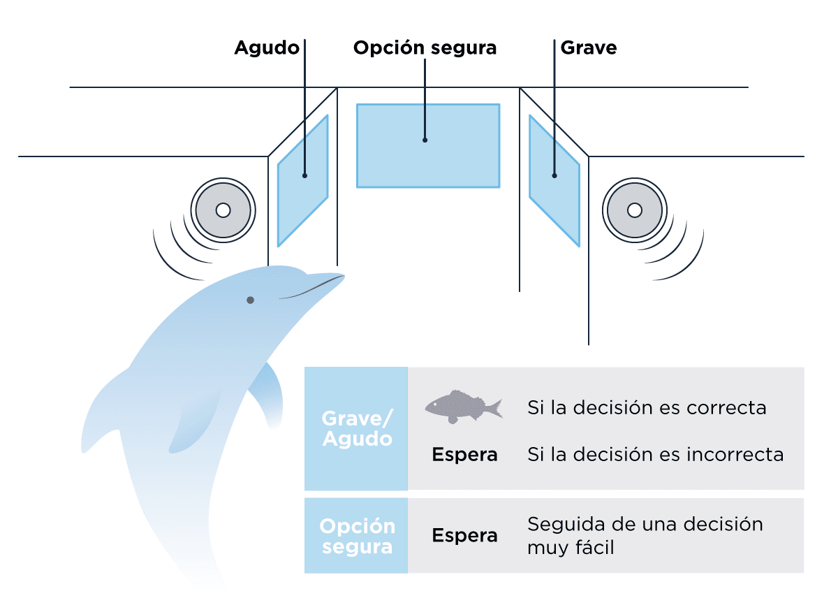 El delfín debía clasificar sonidos como agudos o graves, presionando una de dos paletas (ubicadas en las paredes laterales en la figura). Si respondía correctamente, recibía una recompensa (pescado); si respondía incorrectamente, debía esperar varios segundos antes de poder iniciar el siguiente ensayo. El delfín también podía seleccionar una tercera paleta (la opción segura) para reemplazar el ensayo por otro más fácil en el cual la recompensa era diferida. Otra que Pasapalabra.