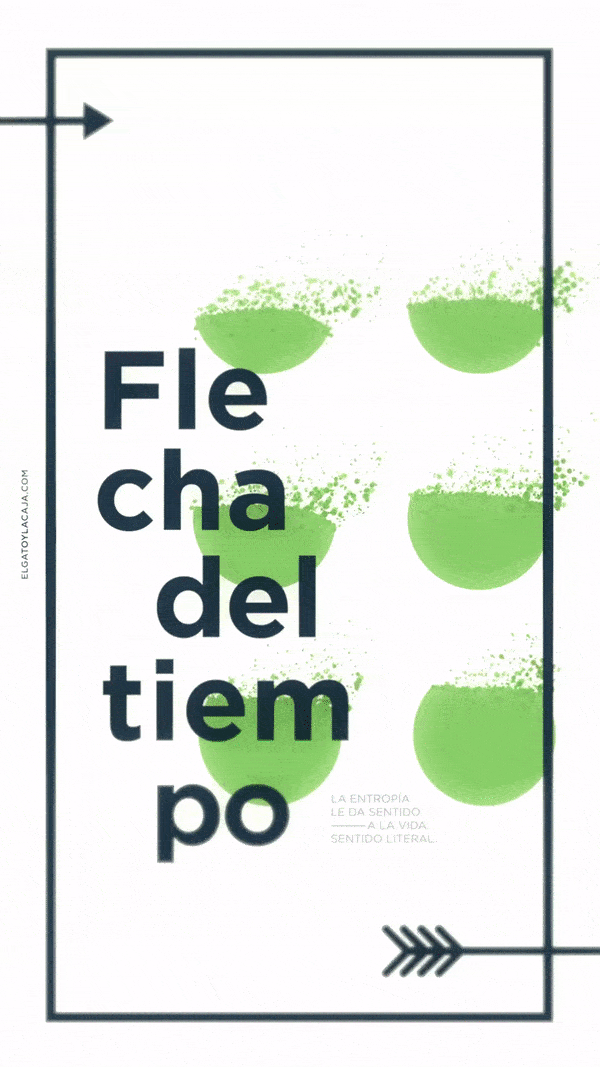 El hecho de que la entropía del Universo siempre aumenta define lo que algunos llaman la ‘flecha del tiempo termodinámica’. Estamos acostumbrados a naturalizar el sentido de avance del tiempo y no es algo que en general nos cuestionemos mucho. Pero, si cayéramos de golpe en este mundo de nada (que es de alguna manera lo que sucedió), ¿cómo podríamos asegurarnos para dónde va la cosa? Es decir, en un momento determinado del tiempo, ¿cómo decidimos qué es el pasado y qué es el futuro? Podemos decir que el pasado es cuando la entropía es menor y el futuro es cuando la entropía es mayor. Dicho de otra forma: si nos muestran un video de un gas violeta separándose mágicamente en dos gases de colores azul y rojo, es fácil darse cuenta de que está siendo reproducido en reversa y, como vimos, se trata de un proceso en el que la entropía aumenta (para más ejemplos, pensemos en un montón de cenizas que empiezan a formar un cigarrillo).