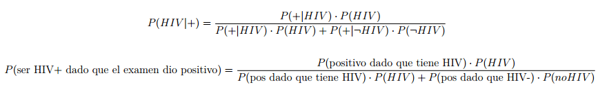 Esta idea, la de ‘evidencia previa’, es el gran grano en la cara de Bayes. ¿Cómo nos aseguramos de estar estimando bien las situaciones previas? ¿De dónde sale esa información? ¿Cuánto le creo? Estas y muchas otras preguntas las pueden hacer en un congreso de estadística, porque es el gran tema por el que se están matando hace años y porque no tengo una respuesta. Lo que sé es que, a los fines de este problema, la evidencia previa que voy a usar van a ser los mejores datos poblacionales que tenga disponibles, que me dicen que, en Argentina, el 0,4% de la población total es portadora de HIV (o, en términos que puedo usar en la ecuación, 0,4/100, o 0,004).