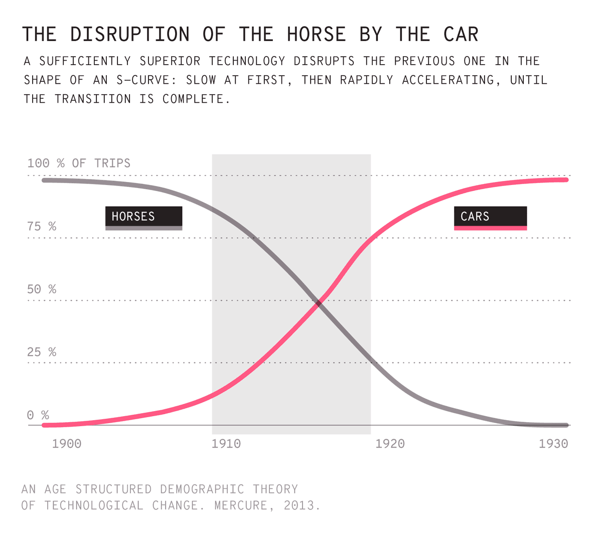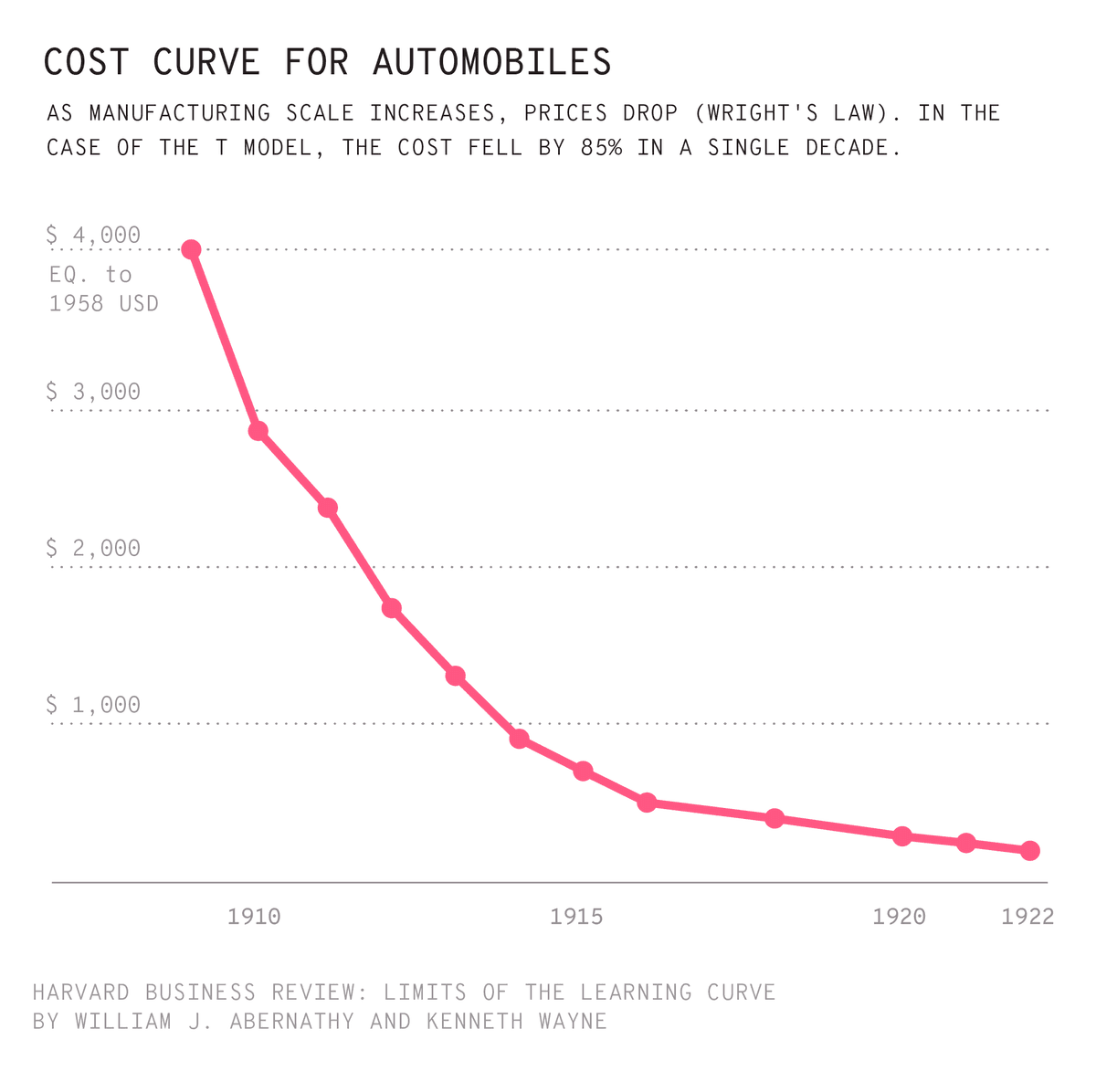 Of course, not every superior technology is capable of triggering and accelerating that cycle. The phenomenon only occurs if costs decrease as scale increases. So it would be more accurate to say it wasn’t the car that disrupted the horse—it was the cheap, mass-produced car, accessible to the majority.