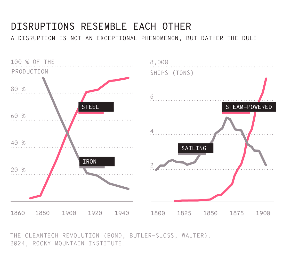 Disruptions have an underlying mechanism known as a feedback loop: a cycle of positive, accelerated reinforcement that traces a consistent pattern over time. Increased car production lowers costs and makes this product more accessible to more people, which in turn demands more infrastructure and stimulates an entire set of surrounding industries that increasingly depend on car production continuing to grow. It can also be put this way: more cars lead to more cars.