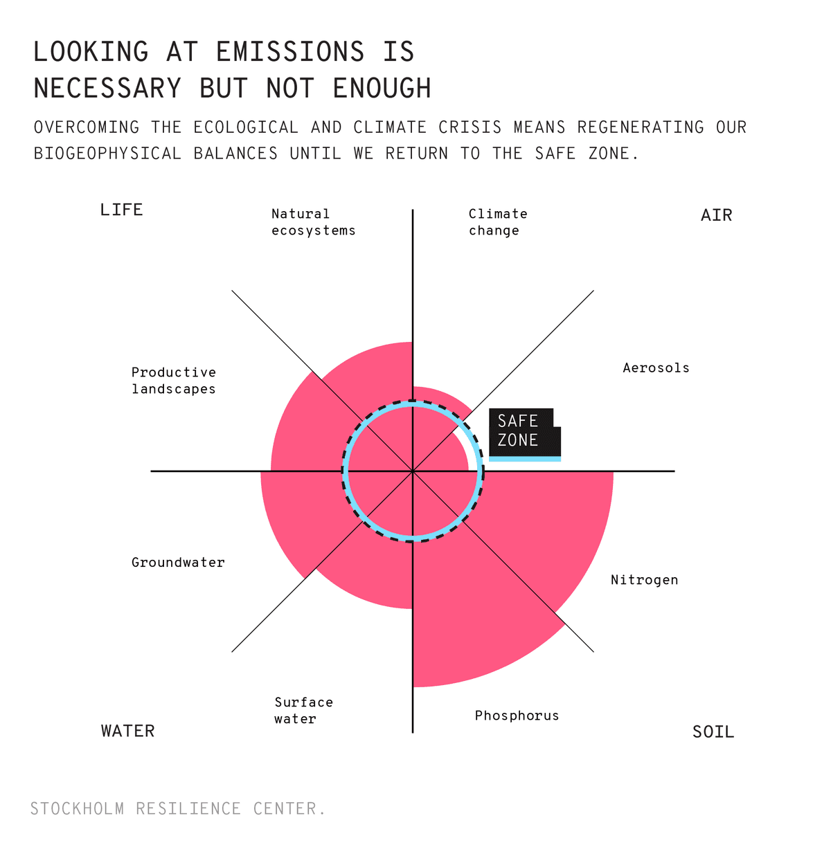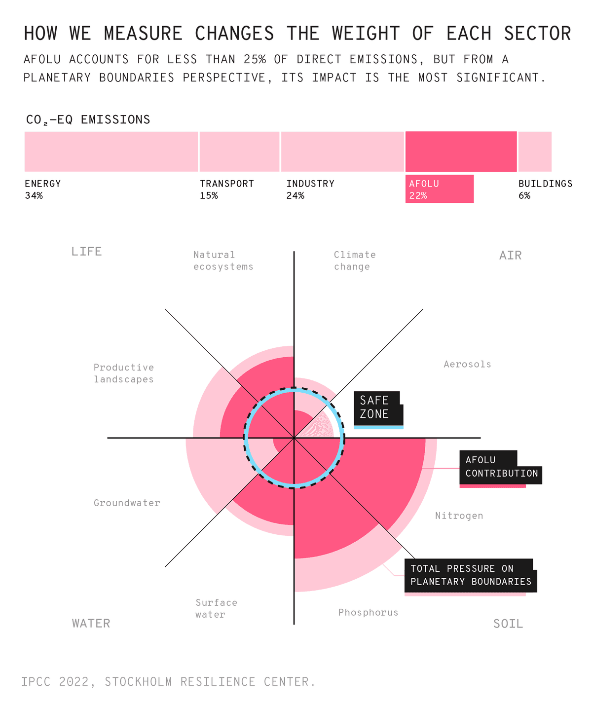 Thinking in material terms involves two major productive domains: the production of food and the management of the land where we grow it (AFOLU, from Agriculture, Forestry and Other Land Use), and the materials we use to build our objects and environments, along with the ways we transform those materials. That entire complex matrix that gives us fertilizer, corn, leather, cement, and hamburgers is about to change radically. We can no longer afford the cost of maintaining it. It will change because the pressure on key planetary systems has reached a limit. Keeping it as it is means choosing collapse.