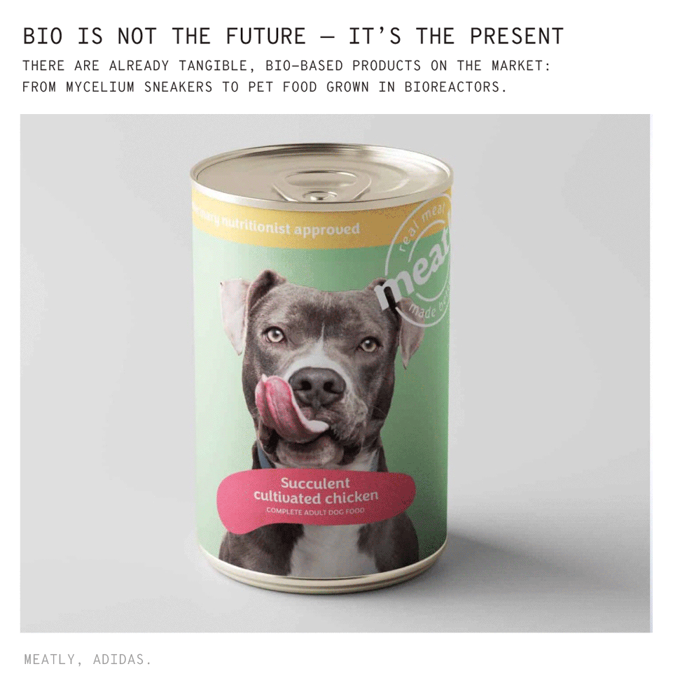The revelation has the force of those things that were always there but are rediscovered in a moment of need—like finding money forgotten in a pair of jeans. We’ve already built airplanes with materials inspired by honeycombs made by bees and wasps; the Velcro on our clothes mimics the burr plant; and professional swimsuits have been designed based on the hydrodynamics of shark skin. We’ve also made buildings that manage heat with the elegance of pinecones, and bullet trains that cut through air like birds. In short: we’ve always used nature as a teacher, foundation, model, and aspiration. The difference is that we spent the first few thousand years fermenting wine and cheese—then suddenly, we learned to ferment and grow medicine, cosmetics, plastic, milk, meat. We now know how to make breathing bricks from fungi. Steaks that require 90% less water and energy. We’ve taken a step further.