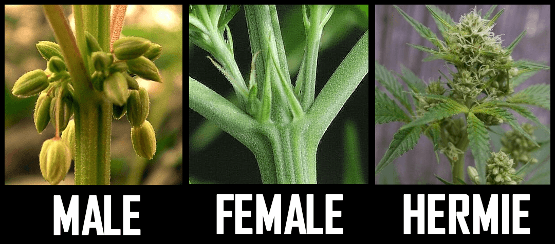 Cannabis imperfecto. Podemos ver que hay organismos adultos que sólo tienen estructuras florales masculinas (izquierda), otros con sólo estructuras femeninas (centro) o ambos tipos de flor en el mismo organismo adulto (hermafroditas).