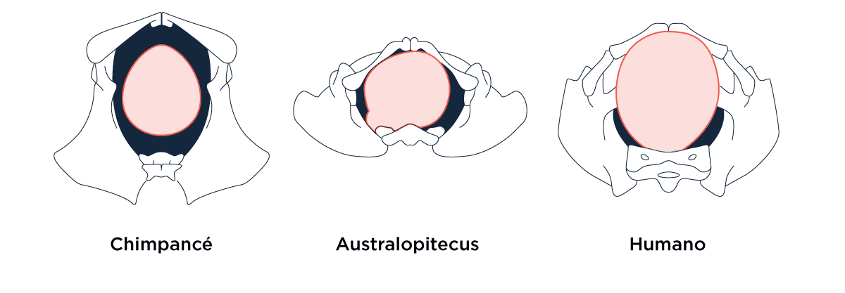 He aquí, entonces, un dilema. Más precisamente, lo que algunos llamaron ‘dilema obstétrico’: caminar en dos patas tuvo para nuestro linaje muchas ventajas pero las modificaciones de la pelvis que esto implicó llevaron a una reducción del canal de parto, y un canal de parto estrecho complica el nacimiento de bebés con cerebros grandes porque los bebés con cerebros grandes tienen, en consecuencia, cráneos cuyos perímetros o contornos son también más amplios.