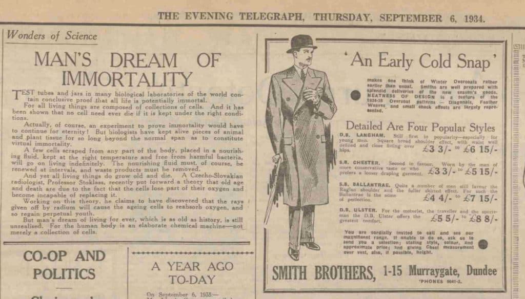 A la izquierda, el Dundee Evening Telegraph anunciando el descubrimiento en 1934, adelantándose 20 años a Henrietta y con mayor precisión que todos los horóscopos de la historia. A la derecha, un bigote y un bombín fantásticos.
