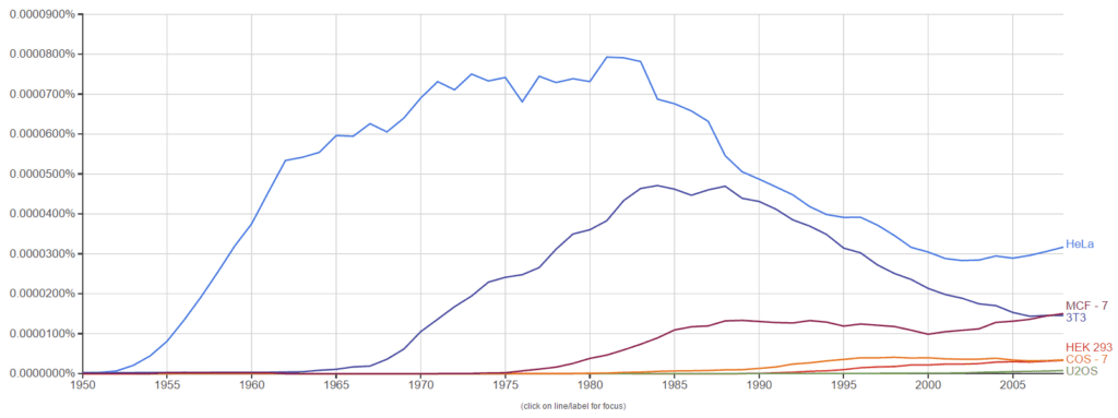 Ngram sobre el uso de distintas líneas celulares inmortalizadas a lo largo de los años. Al momento de producir el gráfico, Mirtha no se encontraba todavía indexada.