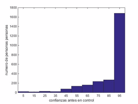 Noten que las dos columnas de la derecha suben cuando pasamos de azul a verde y todas las demás bajan. O sea, en el grupo de control, en que no hay manipulaciones, las confianzas después de la repregunta aumentan, en promedio, en relación a la confianza inicialmente dada en la pregunta, hay más personas que reportan confianzas altas.