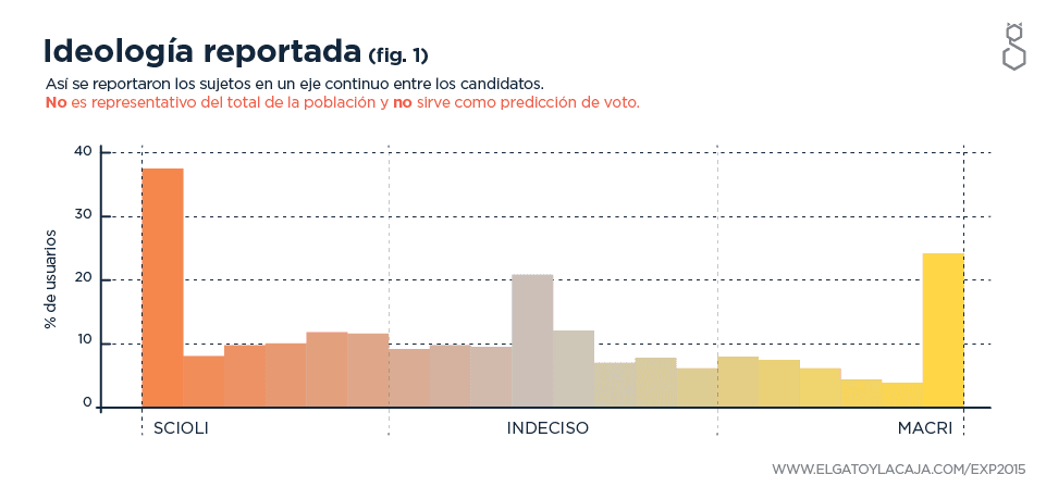 Nuestro experimento constaba de varias partes. Al principio, tratamos de establecer el voto pasado y le pedíamos al sujeto que se ubicara en una línea contínua entre Daniel Scioli, que compite por el oficialismo, y Mauricio Macri, candidato de la oposición en el ballotage del 22 de noviembre. De esta manera, podíamos tener acceso a una gran calidad de información sobre la distribución de votantes, así como sobre la intensidad con la que se definían a sí mismos.